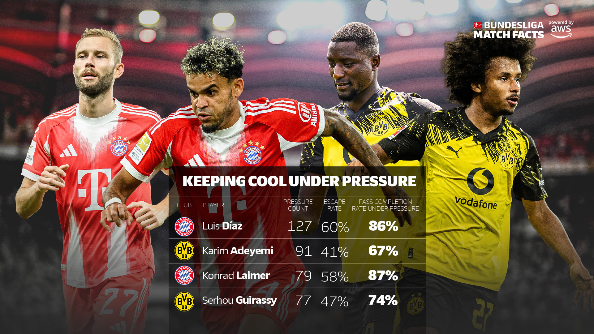 第一轮国家德比前,德甲官方数据AWS就曾强调指出:路易斯·迪亚斯在压力下极为冷静。在本赛季的127次压迫情境中,迪亚斯成功摆脱了其中的60%。更令人印象深刻的是,在压迫下,这位哥伦比亚人的传球成功率高达86%(数据截止2025年10月17日)。
